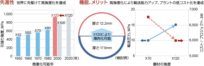 当社は、最近クリーンエネルギーとして注目を集める、天然ガス開発事業へのアプローチとして石油メジャーExxonMobilと共同で世界最高強度のラインパイプ(規格名称:X120(引張強度915MPa以上))を開発しました。X120はこれまでの製品(X70~80)に比べ格段に経済性が向上しました。天然ガスをより高圧にすることで一度にたくさん、遠くまで輸送できます。構造自体も軽量化できるので設置コストが大幅に下がり、エネルギーの安定供給に貢献しています。