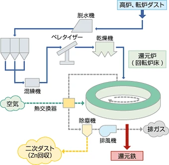鉄の製造工程では不可避的に副産物として製鉄ダストが鉄分換算で約5%発生します。製鉄ダストには酸化鉄、炭素のほかに高揮発性の亜鉛等が含まれています。