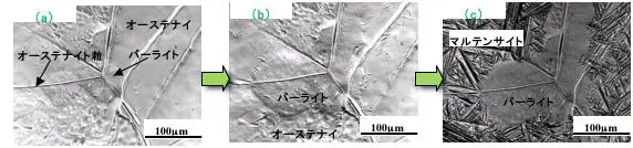 (c)さらに温度が低くなると、残ったオーステナイト相から針状のマルテンサイト相(※4)への速い相変態(※5)が起こる。