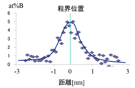 このような、特性制御を可能とするのは、鋼材の成分制御、組織制御に因るものですが、これらの制御すべき因子(例えば、集合組織、粒界偏析、析出物など)は、nmレベルから原子レベルとなってきています。当社は、原子レベル分解能の電子顕微鏡技術の開発やアトムプローブ電界顕微鏡技術を他社に先駆け、いち早く開発を進めてきました。図1は、高い焼入れ性を示すボロン添加鋼において、旧γ粒界に偏析したボロンの分布を世界で初めて検出した例を示します。旧γ粒界に偏析したボロンがフェライト変態を阻害し、焼入れ性を支配する機構を証明するものとなっています。