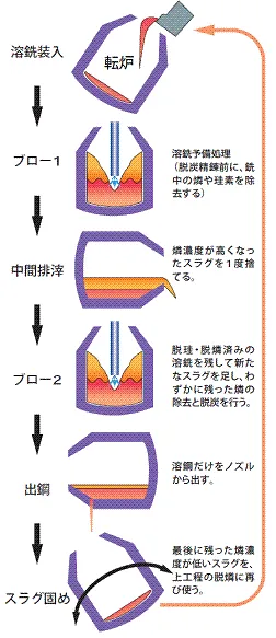 高級鋼の製造ニーズを背景に開発されたSRPによって低リン低硫鋼の安定製造が可能になりましたが、その反面で、転炉への溶銑装入温度が低下し、スクラップ使用量が制約を受けるようになりました。そのため、近年では、”転炉型の脱リン処理法”の特徴である強攪拌下での高速脱りん精錬能力とスクラップ溶解能力を生かした新たな操業形態が開発されました。