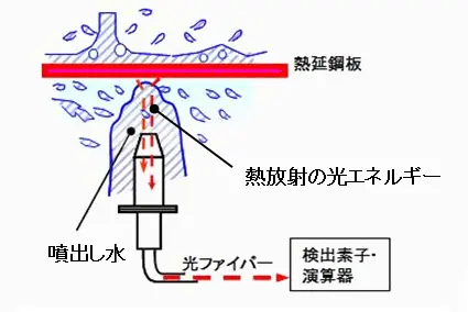 圧延中のように高速に移動する鋼材の温度を調べるためには、非接触で測定が可能な放射温度計(パイロメーター)が用いられます。この放射温度計は対象物(鋼材)からの熱放射の光エネルギー(可視光~赤外線)を検出しますが、途中に水滴などが存在すると光エネルギーが散乱・吸収され著しく減衰して安定に測温が出来ません。とくに圧延中では鋼材の特性を向上させるため水冷却が重要であり、その過程での測温技術が望まれていました。