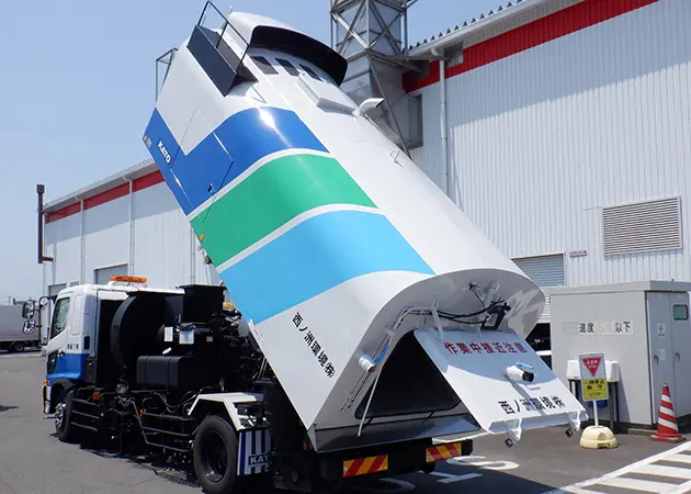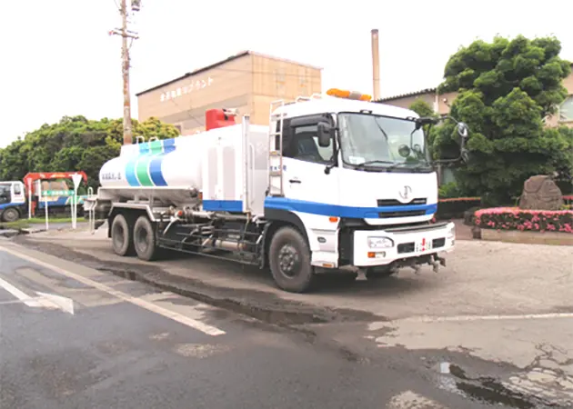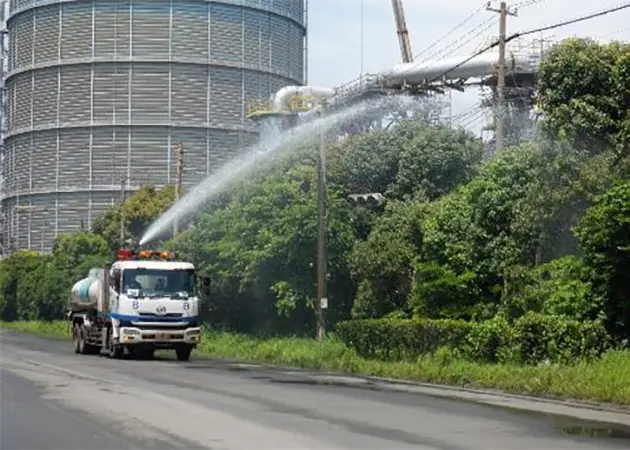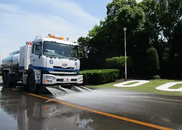 道路散水車により、製鉄所内の道路上の粉じんを洗い流すと共に、表面を湿潤化することで、道路からの粉じん飛散を抑制しています。