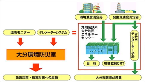 製鉄所では常時環境監視を行うとともに、大気データはテレメーターシステムで大分市へも同時に伝送しています。