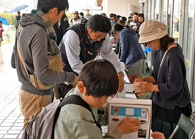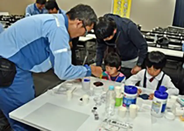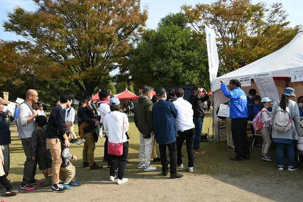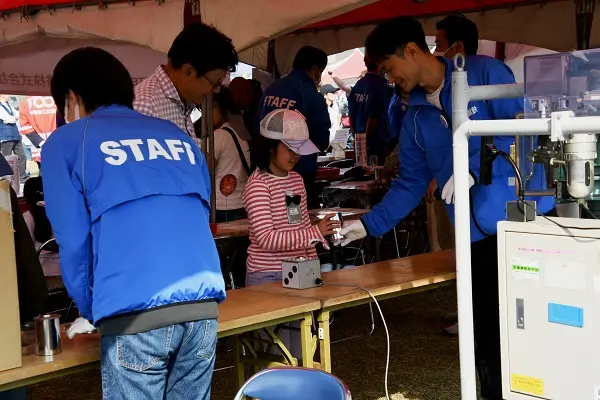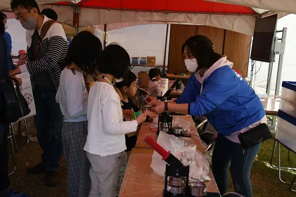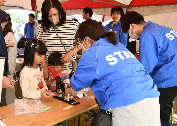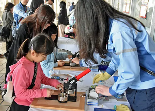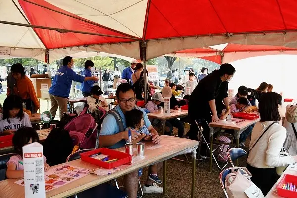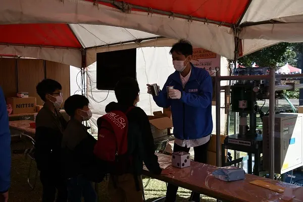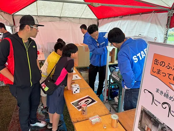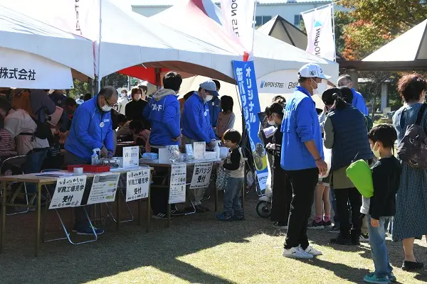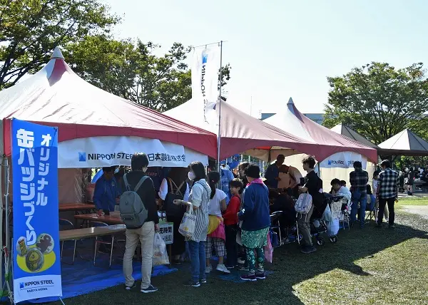 当所は元浜公園会場に日本製鉄ブースを出展し、初日の2日にスチール缶マイ貯金箱づくり、翌3日は、オリジナル缶バッジづくりを実施しました。初日は、あいにくの大雨にもかかわらず250人、2日目は秋晴れとなり780人が来場し、多くの家族連れらで賑わい、休日を楽しみました。参加者には、当所のオリジナル缶やメモ帳、マスキングテープをプレゼントし、好評を得ました。