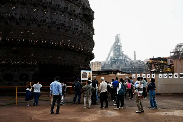- 日本古来の製鉄技術を紹介する「たたら製鉄」も行われ、レンガ組みによる炉の製作から鉧(けら)出しまで新入社員らが実演、炉を崩して真っ赤な鉧が出てきた時には見学者から大きな歓声が上がりました。製鉄所見学会では、熱延工場の見学やスラブを運搬する特殊車両の走行実演などが行われ、見学者は真っ赤な鉄の板が薄く延ばされる様子を興味深く見入っていました。