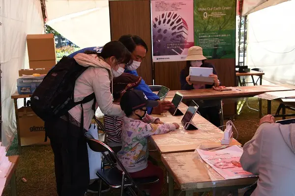 今年は構内大型工事等の影響で製鉄公園での開催ができないことから、元浜公園会場に日本製鉄ブースを設けました。2日間、タブレットを用いた360度動画による工場見学と製鉄所の紹介に加え、鉄に触れる企画として、5日はスチール缶マイ貯金箱づくり、6日はオリジナル缶バッジづくりを実施し、両日で1,000人を超える家族連れが詰めかけ、秋晴れの休日を楽しみました。参加者には、当所オリジナルのバッグやメモ帳、マスキングテープをプレゼントし、好評を得ました。