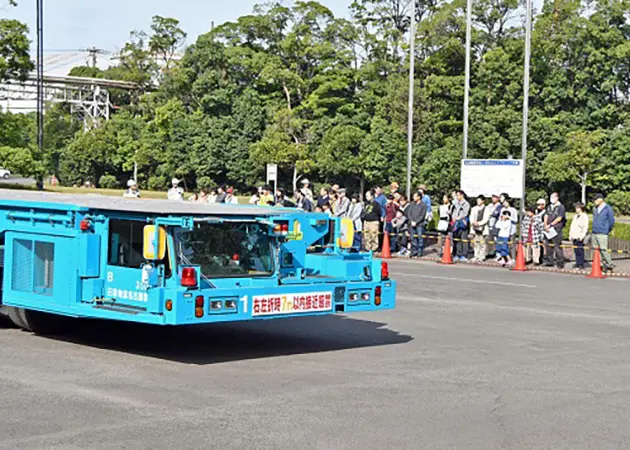 工場見学は、今年から発着場所をゲストホールへ変更し、両日で791人が参加しました。高炉マンテル展示場では、名古屋製鉄所のシンボルである高炉について理解を深め、高炉やマンテルを背景に記念撮影を行いました。その後は、高炉の出銑や次世代熱延ラインの建設現場などを車窓から見学しました。新企画である協力会社有志による特殊車両の展示では、構内を走行しているトレーラーやホイルローダーなどを見学。キャリアカーの旋廻デモンストレーションも行われ、独特な動きに参加者からは驚きの声が上がっていました。また、参加者には特殊車両が描かれたトレーディングカードや当所のスラグを利用した肥料が配られ好評を得ました。