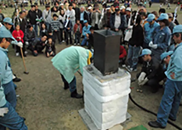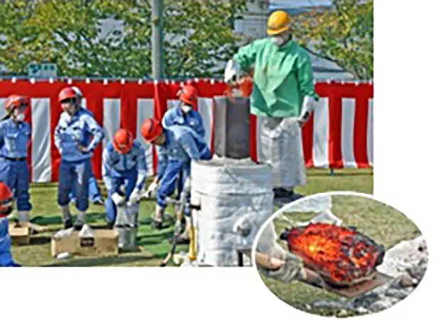 今年で3回目となる「たたら製鉄」の実演は、2基の炉を製作して日本古来の鉄づくりを披露しました。「東海たたらの会」の指導により、1基はスタッフ系新入社員が、もう1基は東海市立青少年センター主催の「青少年いきいき体験事業」の中学生から大学生までの8人を招き実演しました。炉の周りには大勢の人垣ができ、真っ赤なノロが流れ出る様子や炉の中から現れたそれぞれ約10kgの鉧(けら)に歓声と拍手が沸き起こっていました。