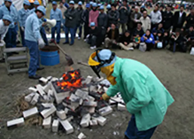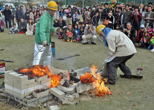 2日目は風が強く冷え込んだものの秋晴れとなり、轟轟戦隊ボウケンジャーショー、ビンゴゲーム大会、吉本興業の「ミニ新喜劇とお笑い」など多くの人出でにぎわいました。今年、新たな企画として当所と協力会社でつくる「東海たたらの会」が日本古来のたたら製鉄を実演し、注目を浴びました。炉が壊されて中から真っ赤な鋼の塊「鉧(けら)」が現れると見物人から歓声が上がっていました。