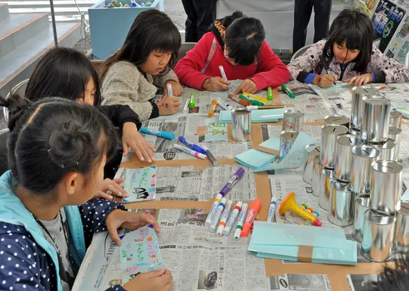 - また、「スチール缶の貯金箱&リサイクルコーナー」では、当社ブリキ材を貯金箱に加工した缶に子供たちが自由に絵をかき、自分だけの貯金箱を作ったり、電磁石を使ってスチール缶が簡単に選別出来ることを体感したりして、スチール缶がリサイクルの優等生であることの紹介を行いました。