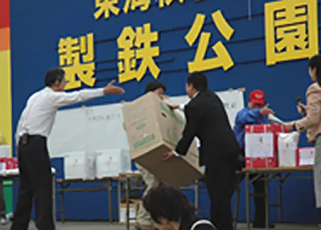 「新日鐵住金杯」東海市中学生スポーツ大会や会場案内、工場見学の案内、スチール缶貯金箱&リサイクル、スラグ・リサイクル、防災コーナー(煙体感、消火器放射体験)、新鮮野菜・果物大安売り、たたら製鉄実演会等には、多くの所員が協力しました。