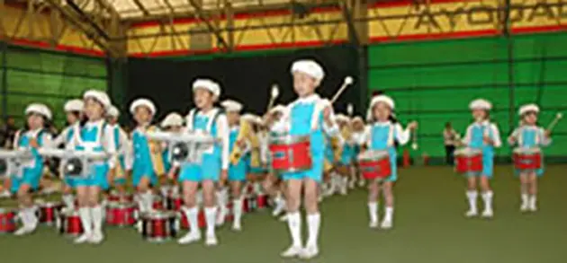 1日目は小雨のため、製鉄公園会場セントラルパークのジャンボパレードは中止となり、オープニングセレモニーも会場を体育館玄関ホールに移し行われました。また、ドリルジャンボリーも会場を屋内練習場に移し、多くの家族が見守る中、かわいらしい幼稚園児の演技が披露されました。