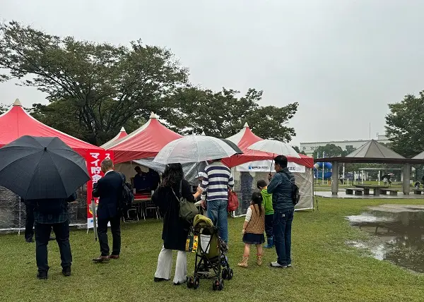 14日の製鉄公園会場は、あいにくの雨模様で、セントラルパークで開催予定であったイエス・ノークイズ、スチール缶のカゴメトマトジュースで乾杯、ビンゴゲーム等のイベントは室内練習場で行われました。