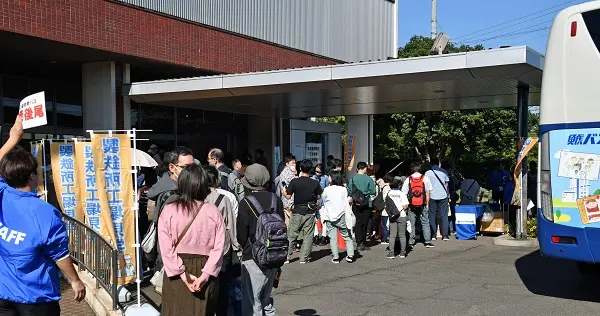 また、4年ぶりに開催した工場見学は、整理券を求めて長蛇の列ができる盛況ぶりで、両日で約700人(計17便)が参加しました。高炉マンテル展示場では、名古屋製鉄所のシンボルである高炉について理解を深め、高炉やマンテルを背景に記念撮影を行いました。その後は、車中から高炉の出銑やスラブを積んだキャリアパレットカーなど、製鉄所ならではの風景を間近で見学し、参加者からは、見学をアテンドしたスタッフへ「説明が丁寧でわかりやすかった」「楽しく見学ができた」等、感謝の言葉をいただきました。 ステージイベントでは、当所所員も所属している虎舞愛好会による勇壮な虎舞の披露などがあり、物販エリアでは姉妹都市の釜石市、米沢市、沖縄市が出店し、本場の味を求める人達で行列をつくっていました。