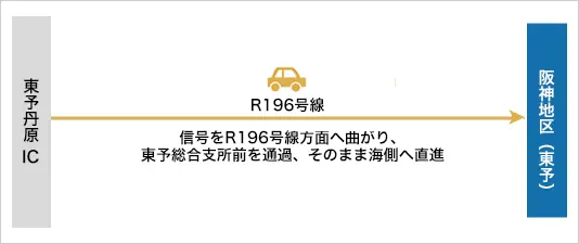 東予丹原ICで下りて、信号をR196号線方面へ曲がり、東予総合支所前を通過し、そのまま海側へ直進。